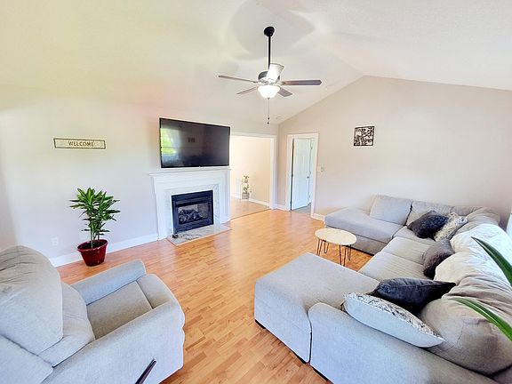ACREAGE! Your new home features 3 bedrms (HUGE master!),2 full baths,ranch w/split bdrms,cathedral ceilings, gas log fireplc. Open kitchen w/lots of counter space & blk/stainless steel applcs w/dining area w/bay window w/view of homestead. Huge master suite also w/cathedral ceilng,master bth,dbl vanity,lg WIC. Water saving toilets, Levolor blinds,security alarm,elec door lock. Great grilling deck w/benches & aluminum railing. Huge backyd,firepit. Includes 12x20 stor.bldg, invisible fencing, new roof house/shed.County water&well! No HOA!