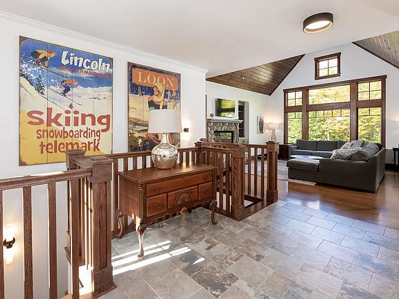 Located in the premier slope-side community of South Peak Resort on Loon Mountain, this family retreat offers almost 3,000 square feet of living space on two levels - perfect to spread out after a long day on the slopes. This newly refreshed, turn-key, fully furnished home is ready for your family to enjoy or use as an investment rental property. The open concept main level features a welcoming tiled foyer area, a vaulted ceiling living room with stone gas fireplace and built-in bookcases, a full dining room and an updated kitchen with stainless appliances, granite countertops and bar seating for meals on the go. A three-season sunroom/porch off the dining room beckons to enjoy the backyard views and breezes during the warmer months. Off the sunroom is a small deck area perfect for grilling. The gleaming hardwood floors continue into the primary suite which features vaulted ceilings, a gas fireplace to cozy up to on snowy winter nights, a walk-in closet and a full bath with a jetted tub and multi-nozzle shower. The newly re-carpeted lower level has a very large family room, with a stone gas fireplace and a full walk out deck for outdoor enjoyment. Off the living area are two bedrooms and 2 full beds, two full bathrooms and a twin bunkroom for the kids to enjoy. Lovely backyard area features a hot tub. The two car garage connects to the house with a mudroom/laundry area and powder room. Ample driveway parking and lots of storage space round out this perfect family mountain hom
