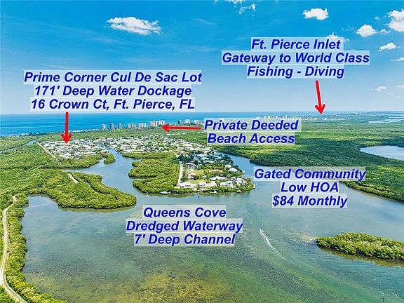 BEAUTIFUL WATERFRONT PRIME CUL DE SAC LOT, with 171 feet of Deep-Water Dockage located in peaceful Queens Cove, a gated community surrounded by nature preserves. READY TO BUILD, high and dry elevated lot. The 90-degree Concrete Seawall is reinforced with Concrete Pilings and a Concrete Cap, it is 131 feet x 40 feet, for a total of 171 feet of boat dockage. The Canal is 100 feet wide on both sections of the seawall. No Fixed Bridges, bring your deep draft and wide beamed Sportfishing Yachts, and Giant Sailing Catamarans, as the Canal has been dredged to a 7 foot depth. Minutes to the Fort Pierce Inlet 2 miles south, gateway to World Class Fishing and Diving. Deeded beach access. Low HOA $84 monthly covers: Electric Gate, Roads, Waterways and Common Areas. QUEENS COVE-PARADISE AWAITS!