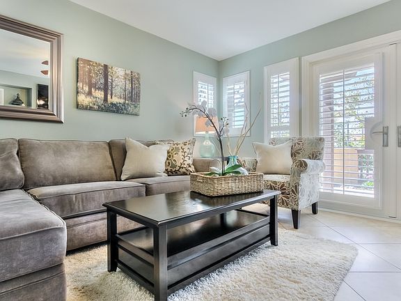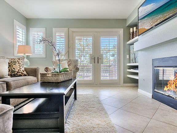 Opportunity knocks in the desirable lakeside community of Brisa Del Lago II. Beautifully updated throughout and ready for move-in, this single story, 2 bedroom/2bath end- unit is just a short stroll to the lake and the resort style community amenities. This light and bright, versatile floorplan features a large master bedroom with patio access and private master bath with dual vanities and a spacious secondary bedroom and guest bathroom are situated on the other end of the home. The kitchen has an abundance of cabinet space and opens to a spacious dining room. The living room features gorgeous tile flooring, a fireplace and French doors leading out to the large patio which faces a tree lined greenbelt for privacy. 18’’ tile flooring, upgraded carpet, custom paint colors, ceiling fans, plantation shutters and newer windows and doors are found throughout the home. Direct access 1 car garage and another 1 car detached garage make parking convenient (new garage doors). Enjoy membership to the beautiful Rancho Santa Margarita Lake and Beach Club and take advantage of hiking and biking throughout the numerous wilderness trails and O’Neil Regional Park. Conveniently located within minutes to shopping, dining and entertainment.
