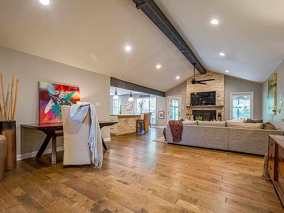This Beautiful Home is a Must See!! Sitting on 5 mile creek with a gorgeous view of the woods and creek while you are sipping your morning coffee. This Remodeled Home has an open floor plan! A Rock Island is a focal point of this open plan as well as the Rock Fireplace. 3 Bedrooms which includes the Master on the Main level makes this Home even more Appealing! You also have an office or dining area on this level. Upstairs enjoy 2 more bedrooms plus a bonus room or craft room and a full bath with double Sinks. New Oven 2023, new master shower 2024. Come by and take a Look Today! Agents see remarks