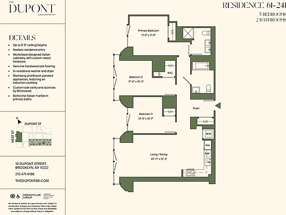 Meet The Dupont, a 41-story residential tower crafted with meticulous design and unmatched views of the East River and Manhattan skyline. This exceptional residential tower offers a collection of studio, 1, 2, and 3-bedroom residences designed by the award-winning Brooklyn-based AD100 interior design team, Workstead. Residences feature ceiling heights of up to 9' 8" and genuine hardwood oak flooring. Modern conveniences include keyless entry access, energy-efficient climate control, and in-unit washer and dryers. Designed by the acclaimed Workstead team, kitchens showcase Italian cabinetry with custom hardware, Bosch induction cooktops, and quartz countertops. Select residences also offer panelized Blomberg appliances and custom Workstead light fixtures. Bathrooms are luxuriously appointed with Bottocino Italian marble, custom oak vanities, and frameless glass showers in select units. Delight in the Design at The Dupont, where thoughtful design and over 20,000 square feet of indoor and outdoor amenities come together in perfect harmony. 24/7 attended lobby -Rooftop Clubhouse with a heated outdoor swimming pool and sundeck Private Dining Lounge with fully-equipped kitchen, terrace, and Manhattan skyline and river views - Social Lounge with fully-equipped kitchen, entertaining area, and gaming room Garden Terrace with BBQ stations, al-fresco dining, and lounge area The Spa with an infrared sauna and private treatment rooms Fitness Center outfitted by Technogym and Peloton Yoga Studio Craft Studio with art supplies and essentials by TULU -Children's Playroom On-site parking with electric car charging stations Discover Greenpoint, a vibrant neighborhood where historic charm meets modern sophistication. Enjoy a diverse culinary scene, unique boutique shopping, and beautiful waterfront parks. With bike-friendly with several bike lanes and paths, nearby transit also includes the NYC Ferry, G, and L trains, and a multitude of bus lines. Schedule a tour today to experience life at The Dupont. Now Leasing.