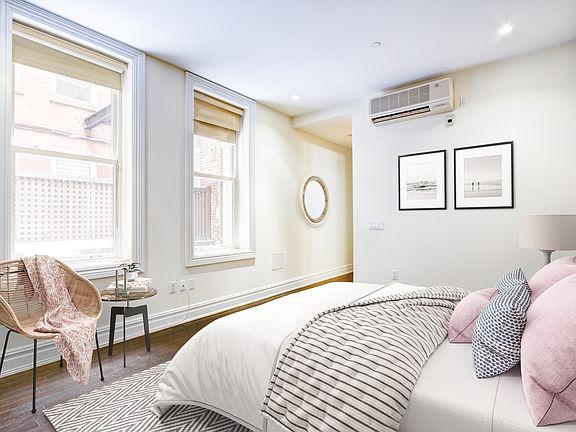 This dramatic 2 bedroom, 2.5 bathroom duplex apartment, set in a 22' wide limestone townhouse, with a full time doorman, is a true jewel of New York's Gilded Age, formerly owned by the Astor family. A careful architectural renovation has preserved the building's nineteenth century grandeur while blending in state-of-the-art modern details. A grand and spacious living room greets you into this sprawling 1,800 SF, 2 bedroom, 2.5 bathroom duplex home which features 10 ft ceilings, beautiful hardwood floors, private patio and a decorative wood-burning fireplace. Marble floors line the hallway and the luxurious bathrooms, while the custom solid wood kitchen is equipped with Sub-Zero, Wolf and Miele appliances. Additional amenities include full-time concierge, multi-zoned Mitsubishi split-air system and washer/dryer in unit.