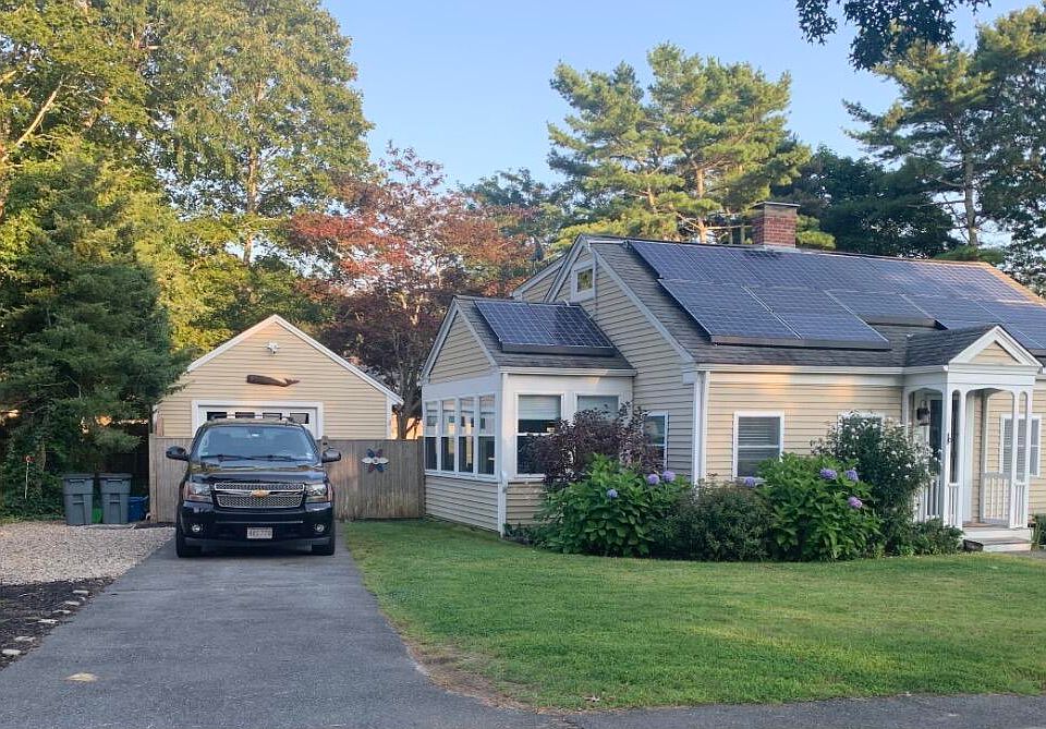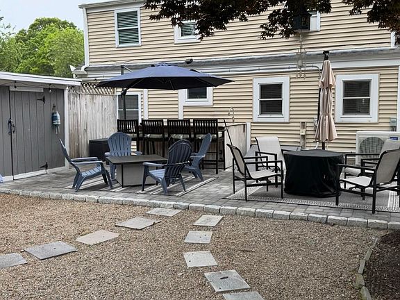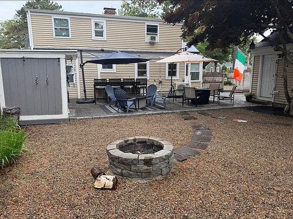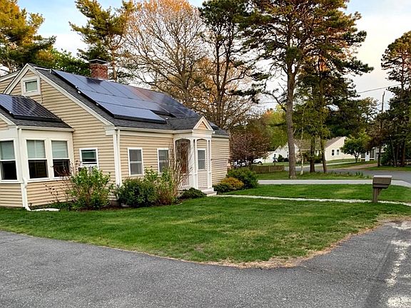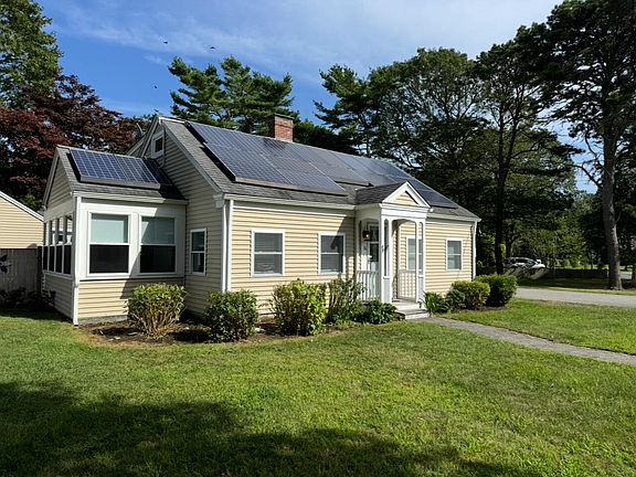 Perfect summer getaway! Vintage Cape Codder offers 4 bedrooms and two updated full baths, a fireplaced living room and enclosed sunporch dining. Electric Mini split heat and AC on first floor, with radiant flooring heated by oil. There is a detached garage conversion into a fun family room with TV and laundry. Lovely Patio and yard have an outdoor bar, shower, shed, Firepit, all fenced in for great privacy. Generous lot with inground irrigation. This lovingly maintained home will be a pleasure to enjoy for both summer and year-round enjoyment. Just minutes to several beaches, as well as local dining and shopping. Experience coastal living with convenience. Schedule a showing today! Convenience to several ocean beaches, Inflatable Park restaurants and shopping. A warm and cozy place to enjoy all of the Cape's amenities. Not to be missed! Solar Panels are leased and transferable to new owners.