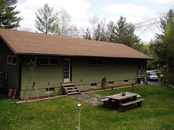This is a wonderful year round home with a quaint private setting. A family home with 3 bedrooms, 2 full baths, and an extra room to be used as a guest room, or craft room. Large Kitchen. Other features are a nice sun porch, propane fireplace insert, laminate wood floors, a large game room in the basement, a large 2 car garage in the lower level, a lovely yard with nicely landscaped adirondack rock steps leading up to the house....Fire-pit for backyard fun. Creek running through from Clear pond