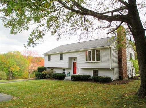 Updated contemporary split with soaring cathedral ceilings and open floor plan. Gorgeous new eat-in kitchen with granite counters, stainless appliances, under cab lighting & custom tile backsplash. Large living room with floor-to-ceiling brick fireplace. Updated bathrooms including main bath with "Hollywood" entrance to master bedroom. Potential for 5 bedrooms as the "office" and "family room" on lower level both have closets.The 40,000 sf lot is private with wooded views out of every window. Large deck off of the dining room overlooking the vast back yard. Fabulous location near commuter rail, YMCA, Franklin State Forest and 495. Town water, sewer, natural gas, recent roof, high efficiency furnace and state of the art on-demand tankless hot water system. This home is ready for the buyer who wants to move in and do nothing but enjoy an updated home!
