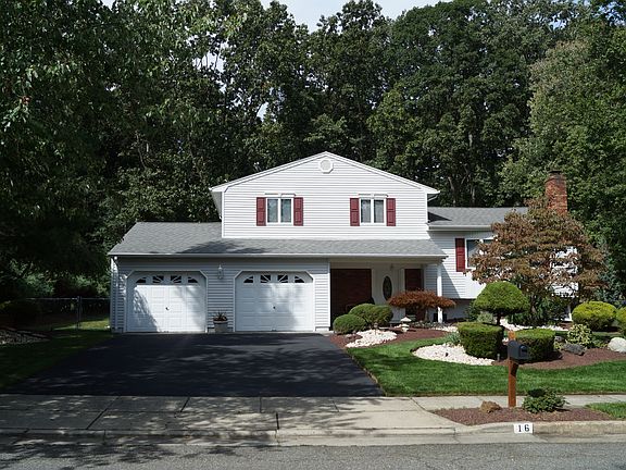 Meticulously maintained 4 bedroom, 3.5 bath split-level on corner lot backing serene Frost Woods. Professionally landscaped front yard, beautifully lit by 25+ landscape lights provides tremendous curb appeal. Spacious entry foyer with ceramic tile and oak hardwood railings/stairs. In-Law suite with full bath and walk-in closet on ground floor. Eat-in kitchen boasts stainless steel appliances, including a slide-in range, under-cabinet lighting, and tile back splash/floor. Living room has brick, wood-burning fireplace with oil-rubbed bronze doors and smoked glass. Dining room has crown/picture-frame molding, and Andersen Frenchwood gliding doors leading to a two-tiered deck and fenced, private backyard. Andersen casement windows and recessed lighting throughout. Finished basement with storage. 2-car attached garage with driveway parking for four. 25 yr. Timberline dimensional-shingle roof. Other features include central vacuum, underground sprinkler system, central air conditioning, and 16 X 10 custom shed. Centrally located near shops, NYC transportation, in Blue-Ribbon East Brunswick school district.
