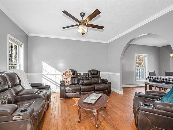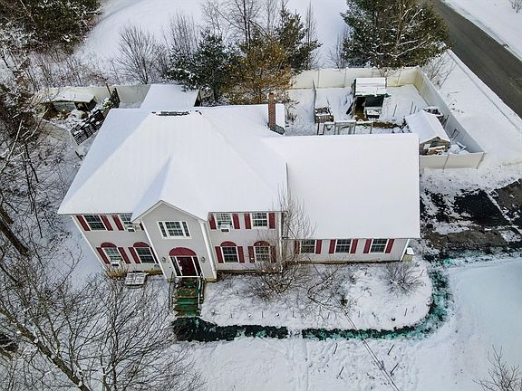 Welcome home to this spacious Colonial with 3 bedrooms, 2 1/2 baths, living room, eat-in kitchen and formal dining room currently being used as home office. Large open-concept 1st floor layout has natural light, pretty door arches, ceiling fans, crown molding, wainscoting & hardwood floors. Eat-in kitchen offers cabinets galore, large island with pendant lights and sliding door out to deck that overlooks fenced yard which currently holds goat pen, chicken coop, fire pit and covered entertaining area. Lot extends beyond fenced area. Primary suite has 2 walk-in closets, tray ceiling with lighted fan, crown molding, wainscoting and lovely full bath with stall shower and relaxing jetted tub. Additional 2 bedroom have ceiling fans and great closets. The 2nd floor laundry closet is an added bonus as is partially finished lower level. Home offers 2-car attached garage & driveway parking for 4 addt'l cars. Charming Town Center is close by as is highway access and other local conveniences.