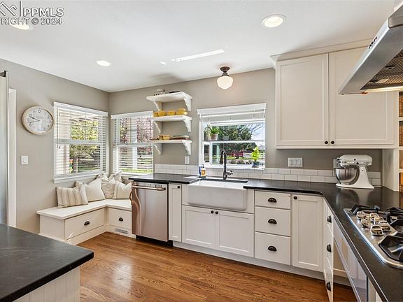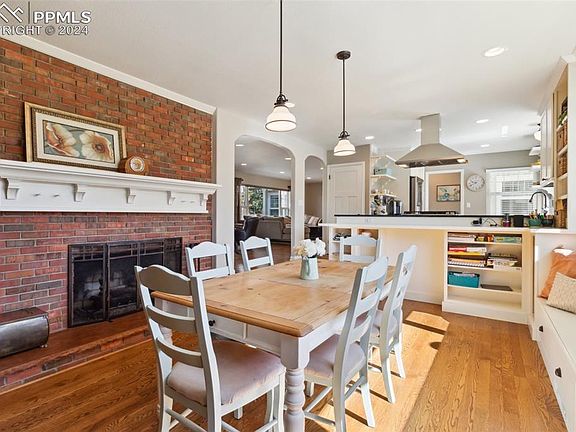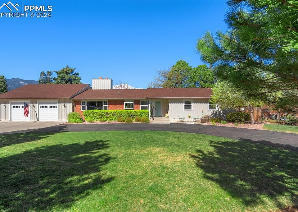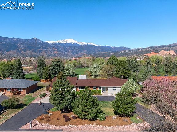 Every detail of this absolutely charming home was carefully and meticulously chosen to enhance its rustic character and capture the stunning Pikes Peak view from every west-facing window. You can feel the warmth of this home the minute you step inside. Come into the sunny kitchen with a cozy corner bench seat to enjoy your morning coffee. Beautiful white cabinetry, gleaming stainless steel appliances, and gorgeous soapstone countertops make this the perfect chef’s kitchen. The sunken formal dining room features wood floors, built-ins to display your special pieces, bench seating with more storage below, and a rustic brick accent wall with fireplace to set the right atmosphere for your dinner parties. The living room faces west, giving you the best view of Pikes Peak right over Pioneer Park. Walk out to the lush private back yard with a pergola-covered patio, hot tub, in-ground trampoline, fire pit area, and treehouse for outdoor fun. You can also enjoy these views from the luxurious master retreat with hardwood floors, quiet seating area, and adjoining spa-bath with soaking tub and separate shower. Rounding out the main level are two more bedrooms, another bathroom, and laundry/mud room with brick floors, laundry sink, and planning desk area. The basement level has something for everyone! Check out the family room with dry bar and cabinets, the workout space, the art studio (or workshop or play space), the comfortable guest bedroom with adjoining bath, and the huge storage room. There are so many other amenities of this home, like the attached over-sized heated 4-car garage with hot and cold running water, updated electrical and plumbing, security system, 2 sump pumps, central A/C, radon mitigation system, central vac, and more!