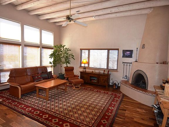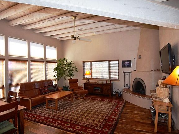 Beautifully remodeled home featuring new hardwood floors, kitchen cabinets, both bathrooms with new tile and fixtures, plastered walls, new paint, natural gas installed, with other features and upgrades to many to list. The home has high ceilings vigas & beams, passive solar allows for a lot of natural light and warmth. Very private, views, covered patio with lovely xeriscaped gardens surround to enhance outdoor enjoyment and hot tub included. The home has been beautifully transformed and is easy to show.