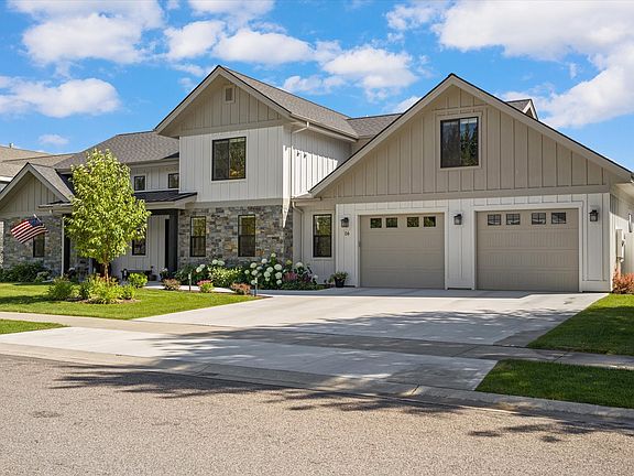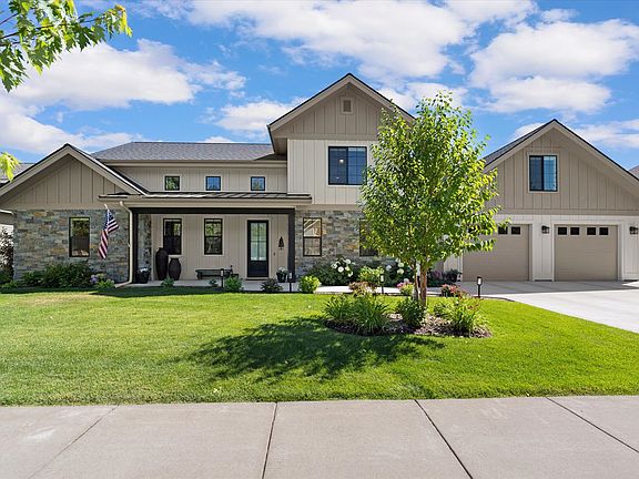 Welcome to 16 Glacier Circle! Located in the coveted Glacier Commons subdivision; this 4 bedroom, 2.5 bathroom stunning home rests on .30 acres of manicured grounds featuring upgraded landscaping, a timber framed gazebo with a stone faced wood burning fireplace and a basalt rock fountain all in a fully fenced back yard. This modern farmhouse style home was built in 2020 and features 3193 sqft of well designed space that offers elevated ceilings, circle sawn wood flooring and custom lighting through-out. Enjoy an abundance of light in the open concept main living space that includes large windows, a great room with recessed luminaire, a custom ceiling wood fan, motorized Hunter Douglas shades, custom built-ins, a stone gas fireplace and a main floor office that has been thoughtfully designed with matching custom cabinets. The bright airy kitchen includes a FE Cafe gas range, Frigidaire column freezer/ refrigerator, walk-in pantry, soft close cabinetry complemented with a herringbone.. tiled backsplash. This spacious kitchen is complete with an island wrapped in a beautiful natural wood finish that perfectly compliments the space. Nicely set off to one side of the home is the luxurious primary suite that is adorned with custom drapes, sheers and french doors that lead to the back gazebo. The en suite offers dual sinks, ceramic tile heated floors, a soaking tub and a walk-in closet that includes a custom closet system. To the opposite side of the home head upstairs where you'll pleasantly be surprised. This spacious full level features beautiful wood flooring, 2 complete bedrooms and a large bonus room or additional bedroom all with upgraded carpet. The bathroom features subway tile, dual sinks, quartz countertops, brushed nickel fixtures and a room plumbed for an upstairs laundry room. The extended double bay garage includes cabinets, a workbench, shelving units, a slat wall and another thoughtful addition with a maintenance closet that includes a deep sink, water softener and an instant hot water heater. Smart features are included with upgraded WiFi infrastructure including commercial quality switch and router, alarm.com cameras throughout and Lutron RA2 light switches that allow smart home control. From luxury to tech; this extraordinary home truly has it all. Call Holly Avallone 406-407-2355, Austin Baumgarten 406-471-1847 or your real estate professional for an exclusive showing.