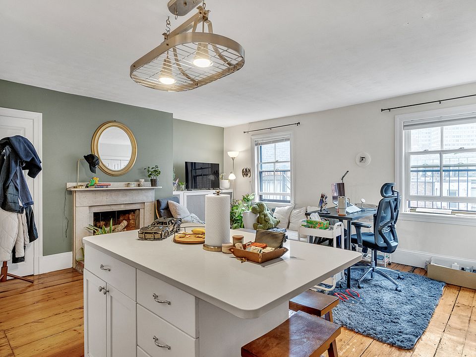 CLOSE to MGH - NO FEE and PRIVATE ROOFDECK! This quiet and cozy open layout apartment is in a garden-fronted building situated on beautiful tree-lined Hancock street on historic Beacon Hill. The unit features beautiful wide pine floors, a marble FIREPLACE (circa 1880), built-in shelving, a partially renovated bathroom, and a renovated FULLY APPLIANCED KITCHEN with quartz countertops and a large quartz island (can seat 4) white shaker-style cabinets, overhead pot rack, and full-sized stove and dishwasher. Seems far bigger than square footage due to the open layout and absence of halls. There good storage, with 3 closets in the apartment (2 are double closets), built in shelving, and a designated STORAGE area in the basement. The basement also contains the building's common LAUNDRY facilities. The apartment is CAT-friendly (sadly no dogs) and in a no-smoking building. Near everything, including MGH, the financial district, shops, Boston Common, multiple T stops. Whole Foods market and CVS are one block away. Good references and good credit required. No undergraduate students. Rent is $2650 a month, which includes heat/hot water. First month's rent, last month's rent and a security deposit are required up front. Available August 1. Call Stan at the number below to see it. Disclosure: The Trustee for the owning entity is a licensed real estate broker but will be renting directly through Zillow and not through the brokerage. Owner pays for heat and hot water. Tenant pays for cooking gas, cable, and electric. NO SMOKING. First month's rent, last month's rent, and security deposit up front. Landlord will install/uninstall the window mounted AC unit during cooling season. Strong credit and references required.