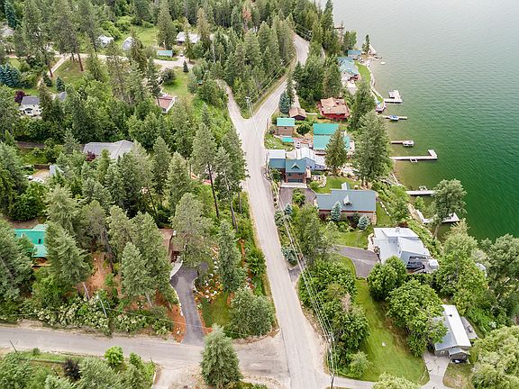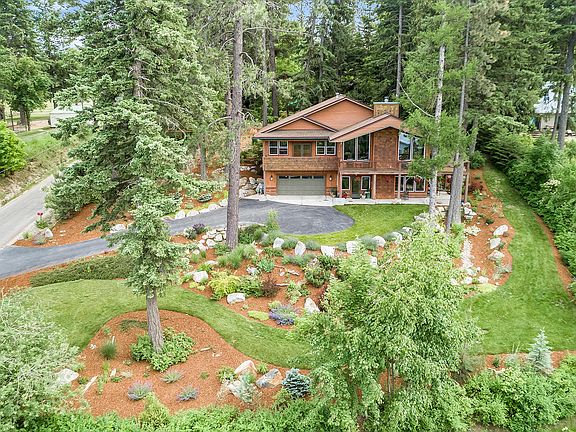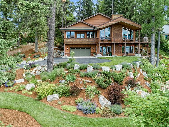 Enjoy breathtaking panoramic views of Lake Pend Oreille, the lights of downtown Sandpoint, the rugged Selkirk mountains, and beyond from both levels & almost every room of this meticulously maintained custom 4bd/3ba home built by Sandpoint Builders. Spacious Master suite has high, vaulted ceiling of natural knotty pine, gas fireplace, french doors leading to private deck, large walk-in closet, & beautiful master bath w/large, tiled walk-in shower, jetted tub, & 7-feet of custom cherry cabinetry topped by a unique natural travertine countertop and double sinks. Expansive Great room is stylish and inviting w/ high vaulted wood ceiling, huge picture windows, & beautiful stone fireplace; Gourmet kitchen w/ granite countertops, SS appliances, custom cherry cabinetry, & long breakfast bar. Great Room access to large wraparound partially-covered deck that has one-step access to back yard. Lower level boasts large family room w/ 3-sided gas fireplace and gorgeous custom built-in wood bookshelves and cabinetry -including space for a large-screen TV & wiring for home theatre surround sound. Enormous laundry room with travertine countertops, plus mud room area with travertine bench just inside back door; Central heat & A/C. Oversized attached 2-car garage w/shop area and tons of storage. More parking available outside garage, in large, paved parking/turnaround area with paved driveway. Partially sloped yard is a gardeners dream - approx 2/3 acre of extensive landscaping, stone paths, stream beds, flowers and trees, attractive raised bed garden with high fencing to protect veggies & established berries from wildlife, as well as grassy fire pit area w/ lake view. Lawn has automatic sprinklers; all garden areas have automatic drip irrigation. Large garden/storage shed as well as wood shed nestled in trees in back corner of yard.