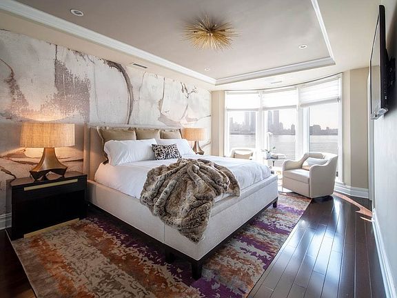 Southeast corner home! 16 Henley Place, a true model of stylish excellence, everyday comfort, & coveted locale. A vibrant floor-to-ceiling bay window and warm, customized fireplace are quite welcoming. The appetizingly colored kitchen has both a nook and a balcony. New York City and its horizon adorn the master suite. A personal elevator takes you to the penthouse lounge, where massive windows open toward, arguably, the most wonderful rooftop balcony on the entire waterfront. 4" glass recessed lighting is always above. Hardwood below. Hunter Douglas beside. Gessi and Waterstone sprinkled about. And Artison speakers are everywhere. Epoxy protects the private garage, amply sized to fit two vehicles. Available furnished.