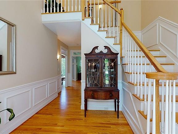 Elegance & style adorn this beautiful Colonial in one of Burlington's most sought after neighborhoods-minutes away from Farmington & Avon. The stone walkway invites you to the front door. As you enter the grand two story foyer, your eyes will feast on the open and sun filled floor plan Gleaming hardwood floors grace the entire first floor. You will enjoy entertaining in your formal dining room displaying crafted shadow boxes/chair railing & wooden framed inlay in the floor all under a tray ceiling. The living room has large windows bringing in the beauty of the outside all year round The eat-in kitchen is the heart of the home offering custom cabinetry/granite counters/tiled back splash/island with a breakfast bar/SS appliances/double ovens/a desk/bar area & sliders to the outdoor stone patio surrounded by stone walls. Just off the kitchen is the large family room with a floor-to-ceiling brick fireplace and crown molding. All doorways are displayed with transom windows above. As you go upstairs, you will find the large & lavish master suite in its own wing. Complete with a vaulted ceiling/extra large walk in closets/a spa like bath with a European tiled shower/double sink vanity/Jacuzzi tub under a vaulted ceiling with 2 sky lights Upstairs has two bedrooms that share a Jack-Jill bath & an en-suite bedroom as well. The grand finale is the bonus room with its own stair case The lower level is pre-plumbed for a bath & C/V and stairs to the garage Level back yard too