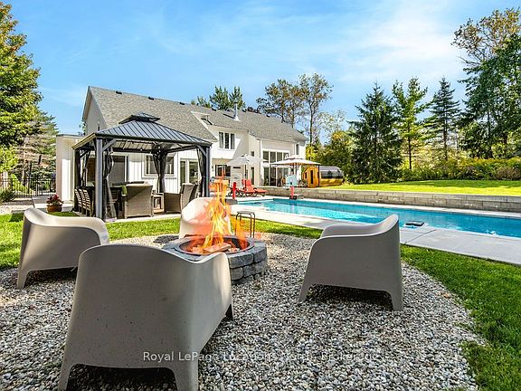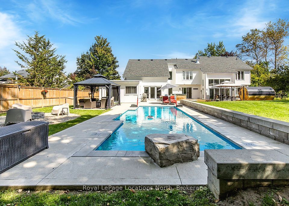 Luxury Living in a Prestigious Neighbourhood Close to the Ski Hills - Welcome to this stunning 3,700+ sq. ft. home offering 5 bedrooms, 4 bathrooms, tucked into one of the areas most desirable high-end neighbourhoods, offering both privacy and prime location, just minutes from the slopes. Set on an impressive 108 x 214 ft x irreg lot, this home has been designed to enjoy the outdoors + entertain all year long.Inside, the main floor offers hardwood floors throughout + offers multiple living spaces, including living room, a private office ideal for working from home, + a welcoming family room w/ vaulted ceilings + a cozy wood-burning fireplace. The renovated kitchen opens to the dining area and features a high-end gas stove, an oversized built-in fridge/freezer, a second fridge, coffee bar, quartz counters, an undermount sink, a walk-in pantry, and pot lights throughout. A spacious main floor laundry/ mudroom includes a designated drop zone, making it the perfect spot for the kids to keep school bags w/ convenient inside access to the oversized 2-car garage.Upstairs, you'll find 3 generous bedrooms, a 4-pc bath, a gym/second rec room with office area, + a large landing perfect for a lounge or reading nook. The primary suite, set privately over the garage, features a large walk-in closet, a spa-like ensuite with double sinks and a walk-in shower, + remote blinds for convenience and luxury. The backyard is an entertainers haven w/a private, fully fenced space w/ beautiful landscaping, a heated saltwater in-ground pool w/hidden cover, + concrete walkways, a gazebo, + a guest house w/ its own washroom, wet bar, bar fridge, pullout king bed. A relaxing sauna completes the retreat, while the oversized concrete driveway doubles as a pickleball court.This property delivers the lifestyle you've been dreaming of,luxury, privacy, recreation, + location all in one. Lg list of upgrades- roof (21), pool (22), primary ensuite (23), sauna (24), septic pumped (24) + more.