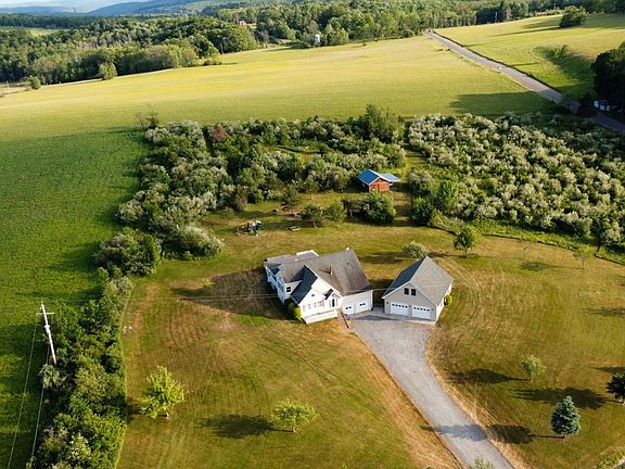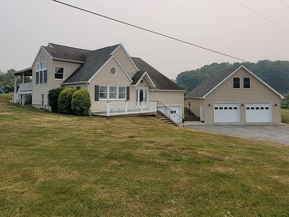 Welcome to a slice of heaven, just minutes from town. This stunning property offers peaceful country living on 5 acres, with breathtaking views. 4-5 bedrooms, 2.5 baths, and 5 garages. Detached, oversized, garage, measuring 38x34, equipped with 220amp electric. It offers ample parking space and the opportunity to finish the area above. Heated basement garage. Step inside and be greeted by a bright contemporary floor plan with plenty of space and windows that showcase the stunning views. The updated kitchen is complete with modern appliances. Cathedral ceilings add grandeur and create an airy and spacious atmosphere. The property also includes a 24x18 barn with a carport. New above-ground pool surrounded by a Trexdeck, perfect for cooling off and enjoying summer days. An additional covered deck serves as a fantastic outdoor entertaining area in picturesque surroundings. This home has been thoughtfully updated with new wood floors, fresh carpeting, and a water filtration system
