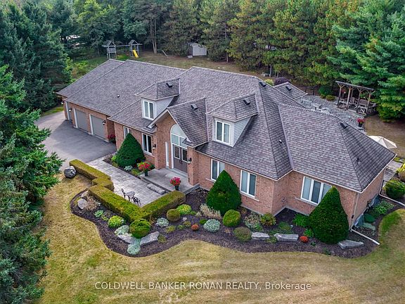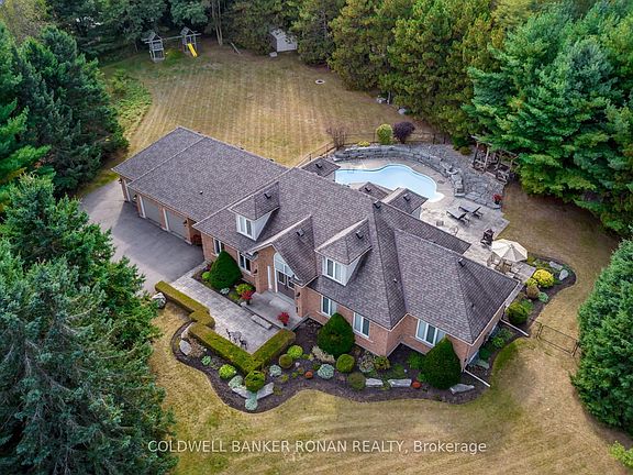 Welcome to this exceptional 2-storey custom built estate home, perfectly nestled on a private and mature treed 4.83 acre lot. The kitchen is surrounded by windows, and fills the space with natural light. The family room, featuring a gas fireplace and a walkout to the patio, provides a cozy gathering space, while the formal dining room is ideal for hosting. An elegant office with french doors adds charm and functionality for remote work or study. This home offers 5 bedrooms, including a main-floor primary suite with a walk-in closet, private ensuite, and walkout access to the back patio. Upstairs, you'll find four spacious bedrooms, including one with a private 2-piece ensuite, ensuring comfort for family and guests. Outdoors, enjoy time with family or entertaining guests with a spectacular inground pool, 65 yard golf hole and a versatile outdoor rink, perfect for skating in the winter and other activities in the warmer months. The expansive backyard provides ample space, sheds for storage, surrounded by lush greenery, and a private trail to access the Caledon Trailway. Additional highlights include an oversized 3-car garage, mudroom/laundry room with garage access and walk-up from the basement. Partly finished basement/rec room/man cave/play zone, and large amounts of additional storage. Don't miss your opportunity to own this incredible home - schedule your showing today!