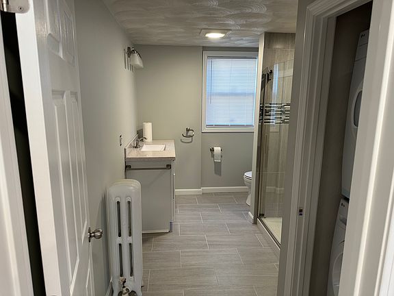 Completely renovated 1st floor apartment with stackable laundry in apartment, granite countertops w/ brand new stainless Steel appliances, walk in shower, 9' ceilings all new plaster w/ hardwood floors, new windows , driveway / parking, in a quiet neighborhood with nearby highway acesss less than 1 mile.