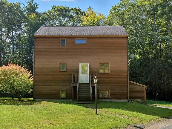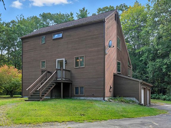 Bring your vision and make this home shine again! With great bones and plenty of potential, this contemporary-style property offers an open-concept layout on 1.9 wooded acres in a well-established neighborhood near Route 125, shopping, and restaurants. The light-filled living room features skylights, a striking brick fireplace with wood-stove insert, and a loft above for extra versatility. Three bedrooms and 1.5 baths provide comfortable space, while multi-level decks overlook the private wooded setting. A two-car garage opens directly into a finished lower level, adding flexible living or workspace. The house is set back from the street, offering excellent privacy. A fantastic opportunity to update and create your dream home. May not qualify for FHA or VA financing.