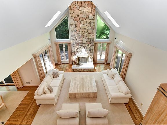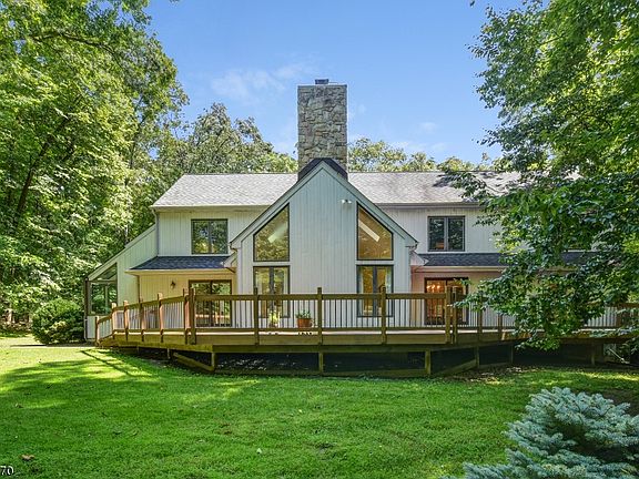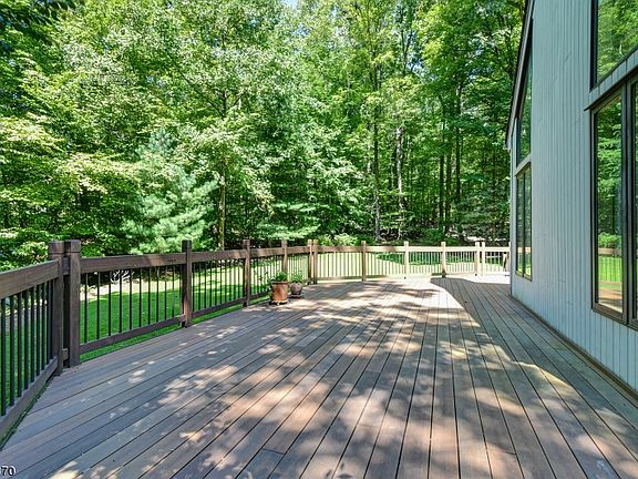 This custom Contemporary is located in desirable Washington Valley, one of Morris Township's most established estate neighborhoods. The spacious nine-room residence is sited on approximately 3.27 private and wooded acres. Featuring four bedrooms, three full and one-half baths, the layout has approximately 3,913 square feet of living space spanning two fully finished levels with additional square footage in a large, unfinished lower level. Notable features include a handsome floor-to-ceiling wood-burning stone fireplace, first-floor master bedroom suite and an expansive three-car attached garage. On the market for the first time in over 33 years, this Contemporary has been lovingly maintained and cared for by the original owners. Entered by a spacious two-story foyer, highlights include a glass chandelier, tile flooring and a double coat closet. The living room is open to the foyer and features a floor-to-ceiling wood-burning stone fireplace with raised hearth, vaulted ceilings, walls of windows and skylights. Other amenities include two sets of sliding doors that lead to the expansive wraparound rear deck. This sun-lit room is also open to the dining room which is appointed with hardwood flooring and a sliding door to the back deck. A handsome six-light onyx candelabra chandelier hangs overhead. The generously-sized kitchen with breakfast area adjoins the dining room. This space is designed with wood cabinetry, a center island featuring tile counters and storage cabinets, and a built-in desk/work station. A sliding door reveals a wood deck. A stainless steel double sink, GE side-by-side stainless steel refrigerator and freezer, Thermador four-burner electric cooktop, double wall ovens and Electrolux stainless steel dishwasher are additional features. Steps away are the pantry and laundry area with ample storage closets and access to the expansive three-car garage. The kitchen also adjoins the wood-paneled library fitted with built-in bookshelves and two full walls of shelving with storage cabinetry. A wall of windows and walk-in closet are additional amenities. The master bedroom connecting to an en suite bath is conveniently located on the first floor. Fitted with hardwood flooring, the sunny bedroom has a wall of windows, skylights, two generous walk-in closets and a sliding door to the back deck. The master bath is appointed with a double sink vanity, a Jacuzzi tub, separate shower stall, skylight and tile flooring. A powder room at the front of the home completes the main floor. Three bedrooms are located on the second floor; one bedroom has its own en suite bath with single vanity and sink and tiled tub shower. Two additional bedrooms in a separate wing share a hall bath. All three bedrooms are generously-sized with hardwood flooring and large windows. The hall bath has a wood sink vanity and tiled tub/shower combination. Outdoor entertaining is effortless on an expansive wraparound deck and the level and wooded backyard. Bucolic views from every room and a convenient location all add to the appeal of this charming countryside home. Morris Township is conveniently located close to all commuting highways, and residents enjoy easy access to everything that vibrant downtown Morristown has to offer. Midtown Direct train service into Manhattan, award-winning restaurants, historic landmarks and the Mayo Performing Arts Center are all closeby. Additionally, Newark Liberty International Airport is about 35 miles away.