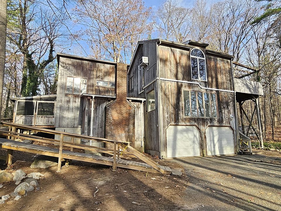 Nestled on a private 1.97-acre wooded lot, this custom wood contemporary awaits a visionary buyer. Unique architectural details are found throughout, offering an amazing opportunity for a creative redesign. The breathtaking sunken living room features a vaulted, beamed wood ceiling and a dramatic stone fireplace with floor to ceiling casement windows WOW! The kitchen and dining area, with its real wood beams and walls of casement windows, is ready to be re-imagined with an expansive deck extending the dining area outdoors overlooking the private grounds The massive primary bedroom with private deck, additional bonus rooms, and four and a half bathrooms provide ample space. The distinctive wood wall in one of the bedrooms adds character, while the large casement windows throughout frame the picturesque, private landscape. Step into a residence where architectural flair meets natural serenity. Envision and create your perfect sanctuary.