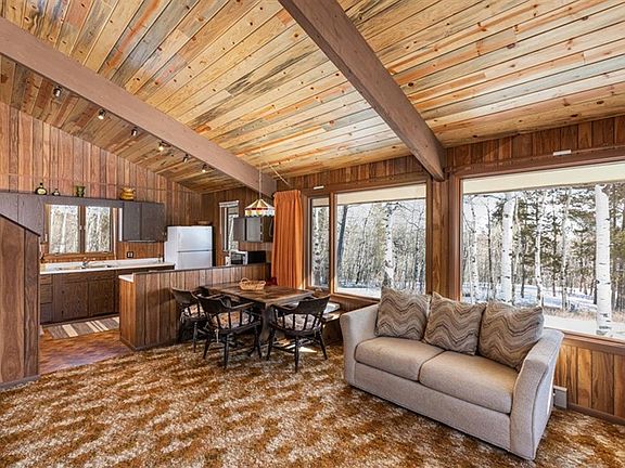 16 Kinikinic is the perfect Red Lodge getaway in a beautiful alpine setting. This cabin is located on 2 lots, where the forest is dotted with pine, fir and aspen and the ground is a carpet of alpine shrubs and wildflowers. The cabin features an open floorplan with a great layout for large gatherings and a mid century modern vibe. The exposed beams and blue pine tongue & groove ceiling highlight the great room where ski boots will dry by the wood stove and board games will be played. Large windows bring in the warmth of the sun, the great outdoors and offer unlimited wildlife sightings. The bedroom arrangements make the most of the space with 3 bedrooms & 2 loft sleeping areas for overflow guests. Enjoy the winter sun or a summer evening breeze from the large front deck with a view of the Palisades and lots of privacy. There just isn't a better setting or a sweeter mountain cabin.