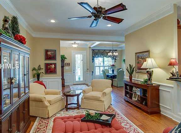 Absolutely lovely home w/ 3BR + bonus (or 4BR), 3-1/2BA, living room and expanded family room w/ fireplace. Handscraped hardwood and tile throughout. Very desirable screened lanai w/ travertine floor offers privacy & views of deep woods, lagoon in distance. Generous sized master suite expanded to include study/ sitting room. 2nd floor bonus room has a full bath. You'll love the design, decor, and lifestyle. Very close to all amenities (walk/ bike/ golf cart) & situated within a quiet culdesac. 2 car + golf cart garage. Seller states home is 3100SF. (ZT)