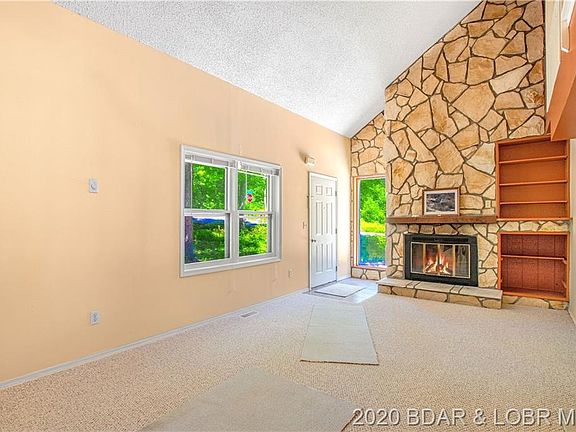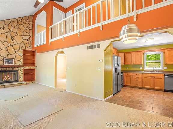 Admire the Modern Architectural Design of this home located in the beautiful Lake of the Ozarks! Embrace the timbered greenery as you pull into the circle driveway with a stone walking path to the home sitting on half an acre. The interior arched doorways, beautiful stone fireplace with blower and vaulted ceilings add the perfect amount of charm to this unique home. A spacious 1,860 sq ft open floor plan with master bedroom and a bathroom just off the living room and two bedrooms and a bathroom on the upper gallery level. Family & friends will adore the back deck wrapping the home, which allows you to keep a weather eye on the children or animals! The lower level would make a great second living area or recreational room and walks out to the serene fenced in back yard with a storage shed and fire pit for family gatherings. There is plenty of parking between the circle driveway, 1 car garage and gravel parking area so give us a call to come see this lovely home today!