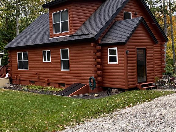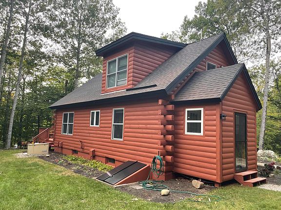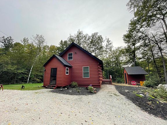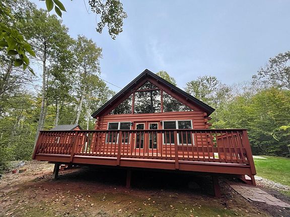 Enjoy the serenity of a cozy cabin nestled in the Maine woods. This well-maintained log cabin sits on 10 beautiful, wooded acres and is located in rural Stoneham's Harding Hill subdivision. The open-concept first floor exudes warmth and charm throughout, each room is surrounded by log siding and beautiful tongue and groove in the newly finished basement. Sun shines in through the great room's cathedral ceiling and expansive wall of windows. Enjoy sunsets from the deck or keep warm inside by the huge floor to ceiling fieldstone fireplace. The primary bedroom is on the first floor making one floor living an option. Enjoy preparing meals with all new kitchen appliances. Plenty of extra sleeping room available in the expansive loft and finished basement bedroom and common room area. Perfect location for outdoor enthusiasts. The cabin is near Kezar Lake and Keewaydin Lake for swimming, boating and fishing. Easy access to the White Mountain National Forest for hiking. Close to skiing at Sunday River and Pleasant Mountain, cross country ski trails and snowmobiling. It is also part of the well-known Fryeburg Academy school district. Don't miss this one!