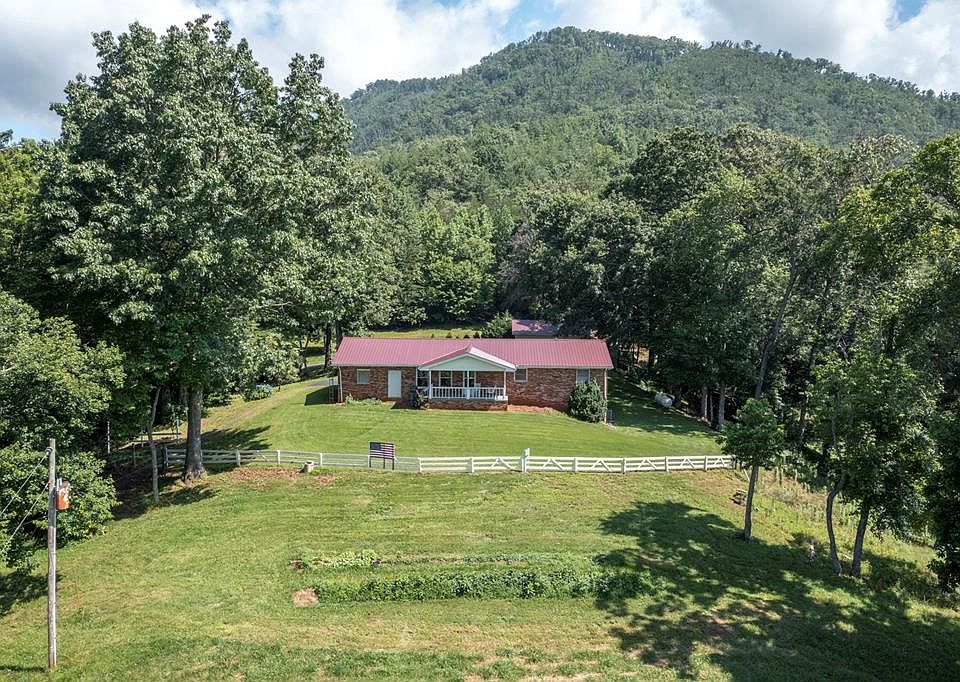 BIG MOUNTAIN VIEWS & A 2 STALL HORSE BARN!! This three bedroom/2 bathroom brick ranch home offers a screened in back porch, spacious front porch, living room with wood floors, open kitchen with dining area, fire pit area, pasture, barn, a garage space for parking plus detached workshop/garage. Basement is partially finished with second kitchen.