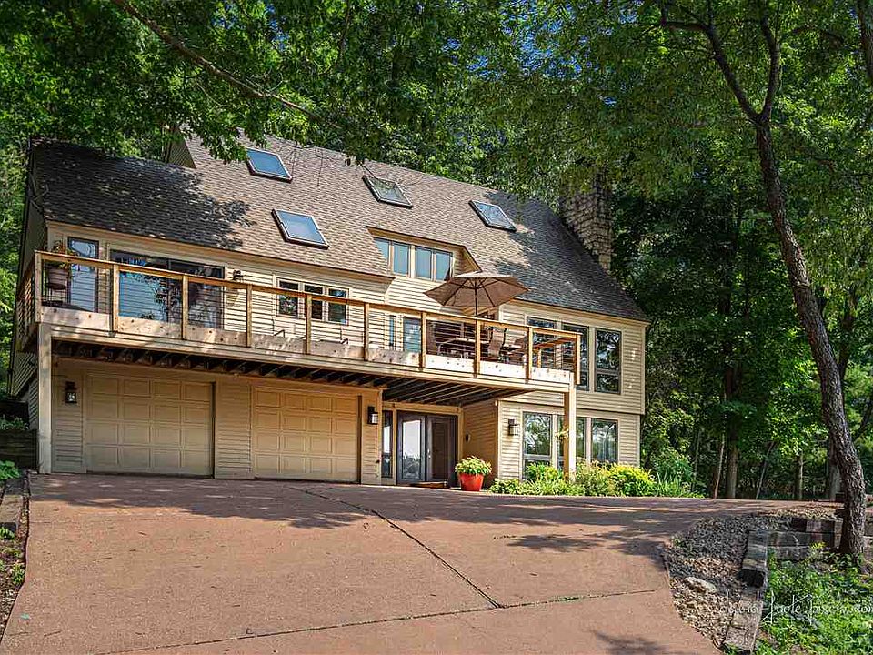 Nestled on a perch amidst the trees on .82 acres sits this 4 bed, 4 bath Timberpeg home utilizing post and beam construction and combining rustic elegance, modern updates, gorgeous views with peeks over Eagle Ridge South Golf Course and a fantastic location on beautiful Longwood Drive. Open main level is flooded by light from multiple skylights above accentuating the warmth of the exposed wood walls and dramatic wood beams Timberpeg homes are known for, and features inviting great room style living area with cathedral wood clad ceilings above, floor to ceiling stone surround fireplace and access to expansive composite deck, completely remodeled kitchen with sleek-lined modern cabinetry and a pop of color, stainless appliances, quartz counters, eat-at peninsula and farm sink, generous dining room with plenty of space for entertaining, spacious master bedroom with adjoining full bath with skylight and whirlpool, and guest bedroom with easy access to additional full bath. Overlooking the main floor is a large loft with plenty of storage and an alcove that could function as great office space, recreation space or family room/media space. Walk-out lower level offers two additional guest bedrooms with tile flooring, one a suite with private bath, additional nicely appointed full bath, laundry room with deep basin sink, utility room, and access to two car under garage with room for storage. Head outdoors to take in the gorgeous views from the updated front deck with composite floor, covered entry porch area or cozy covered stoop leading to wooded backdrop behind. Concrete driveway is even heated, a great bonus feature that is a rare find. Wonderful location is convenient to all amenities of The Galena Territory and Eagle Ridge Resort and Spa golf and facilities. Square footage is approximate and sourced from Jo Daviess County Assessor.