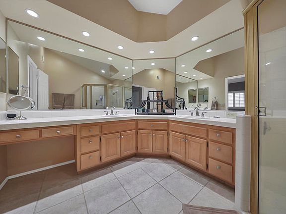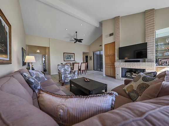 Without question on of the best views in the Lakes CC! South facing interlocking paver expanded patio has spectacular mountain, fairway and lake views. The living room has volume ceilings, a cozy fireplace, and an electric sun shade. Atrium is in place for light and air. Kitchen faces the view and has a 5 burner gas stove top. Kitchen window and slider in BK area have sun shades. Den has a built- in desk area and tile flooring.Laundry in the hallway. Large primary suite and good sized guest bedroom. Great interior unit with a courtyard entry. Located in the highly sought after Lakes Country Club With 27 holes of golf, with great practice facilities, a Racquet center that offers, tennis, pop tennis and pickle ball. A state of the art fitness center with a 4 lane lap pool. A incredible clubhouse with wonderful indoor and outdoor dining. 44 pools and spas, playground, 4 Bocce ball courts. It's a lifestyle!