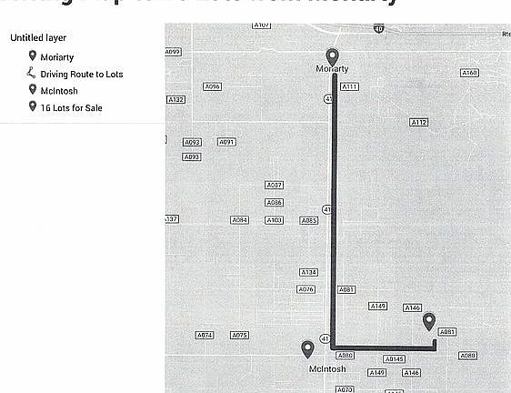 16 Lots for sale: ============= 2 each 1.19 acre lots 14 each 2.38 acre lots Total 35.7 acres. ================================================ See parcel map Golden Valley Estates (above) (lots 5, 6, 7, 8, 9, 10, E/2-13, W/2 -15, 16, 17, 18, 19, 38, 39, 40 and 41) Lot corner pins verified/placed by Tim Oden Surveyors Moriarty in 2001. ================================================== Assessor's Parcel Numbers: Lots 5, 6, 7, 8, 9 & 10 (1 051 043 360 193 000000) West half Lot 13 (1 051 043 500 158 000000) East half Lot 15 (1 051 043 451 158 000000) Lots 16, 17, 18 and 19 (1 051 043 366 158 000000) Lots 38, 39, 40 and 41 (1 051 043 426 091 000000) ========== Cash purchase price: $39,950 (approximately $1120/acre) Terms available ============================================== Directions via Medley road: From State Route 41 McIntosh NM take east Clements road (county road A-080) east for 2-½ miles. Turn left on county road A-081, go 2/10 mile to Medley road (also county road A-081 on Google map). Turn right on Medley road for about 7/10 mile to the northwest corner of lot #41. Use parcel map to locate remainder of lots. ================================ Directions via Berger avenue: From State Route 41 McIntosh NM take east Clements road (county road A-080) east for 2-½ miles. Turn left on county road A-081, go 3/10 mile to Berger avenue. Turn right on Berger avenue for approximately 4/10 mile to the southwest corner of lot #5. Use the parcel map to locate the remainder of the lots. ================= Access: There are 4 roads that access these lots, Berger avenue, Medley road, Leseth drive and Helen avenue. Medley road is also marked county road A-081 on Google map. Leseth drive goes directly to lot 41 from county road A-080 ================================= Utilities: Electricity is located on east Clements road (county road A-080) 700 feet south of lot 41 and along Medley road about 2630 feet from the northwest corner of lot 41. It is also about 1640 feet