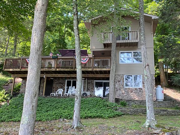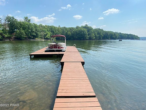LAKE WALLENPAUPACK LAKEFRONT ON PEACEFUL COVE IN PARADISE POINT. 75 FEET OF LAKE FRONTAGE! Home Features Include: 5 Bedrooms, 3 Bathrooms, XL 3 Car Garage with Storage Attic, Large Deck Overlooking The Lake, Large 3 Boat Private Dock, Granite Kitchen Counters, Knotty Pine Cathedral Ceilings, Hardwood Floors, Exposed Wood Beams, Master Bedroom with Juliet Porch, 2 Ductless Split Unit A/C's, Anderson Windows and Doors, Stamped Concrete Patio, Paved Driveway, Mature Landscaping, Hardscaped Lakeside Seating with Built in Fire Pit and so much more.