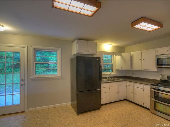 4 bedroom Ranch with 3 full baths! Kitchen comes with pantry and breakfast bar. Beautiful French doors in family room and rec room including a wet bar! Master bedroom suite has full private bath, walk-in closet and slider that leads to outside deck. Two main level bedrooms. 3-zone heating has programmable thermostat. Floored attic with pull down stairs. Full walk-out heated basement is partially finished. Minutes to highway and downtown Mystic. Lots of outside open space to entertain with firepit and plenty of parking and two separate driveways, deck and shed. Close to Lake!