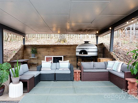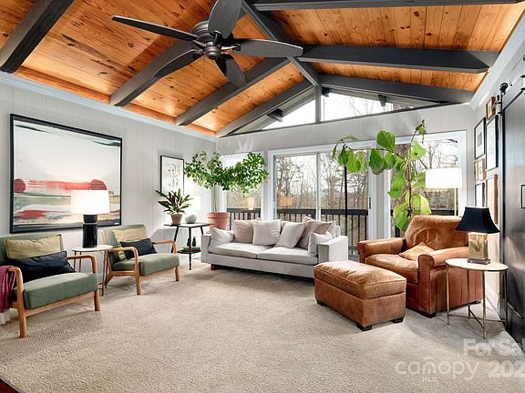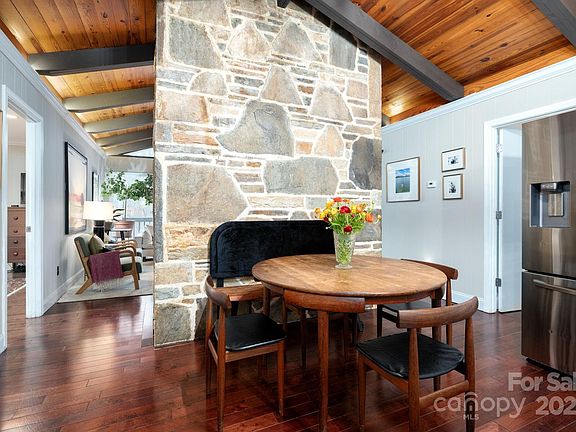 Nestled in South Asheville's Brookwood neighborhood, this cozy cottage is wrapped in character. Stunning stone fireplace with gas logs anchors the home, while striking beams and a vaulted tongue-and-groove ceiling provide architectural detail. The split-bedroom plan and renovated bathrooms offer convenience for owners and guests, while the queen Murphy bed offers options for additional living space as needed. Gleaming hardwood floors throughout, new interior paint and fixtures modernize this home. Kitchen updates include newer appliances, pantry, and cabinet components. Bonus area renovated for home office or workshop. Enjoy extensive outdoor living on the wraparound deck, screened back porch, and upfitted carport lounge. This 0.35-acre cul-de-sac lot sits in a walkable neighborhood with wide streets. Crawlspace provides ample storage. Easy access to downtown Asheville. Four miles from Hendersonville Road amenities; 8 miles to Blue Ridge Parkway, NC Arboretum, and Bent Creek trails!