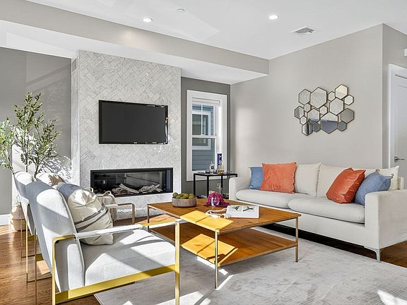 Light pours into this stunning front-facing townhouse-style condo, where contemporary design meets effortless living. The open floor plan is anchored by a sleek gas fireplace with herringbone tile surround and framed by a wall of oversized windows that fill the space with natural light. A designer kitchen shines with West Elm lighting, marble backsplash, and a spacious island ideal for casual dining or entertaining. Upstairs, the serene primary suite features a spa-like bath with dual rain showers, while two additional bedrooms offer flexibility for guests or creative spaces. A private walk-up roof deck offers a sun-soaked retreat with treetop views, ideal for relaxing or gathering with friends. The versatile first-floor flex room—perfect as an office, gym, or mudroom—adds convenience and function. With garage parking, Elfa closet systems, an EV charger, and a location near JP’s vibrant shops, green spaces, and Orange Line T, this home embodies elevated city living with a modern edge.