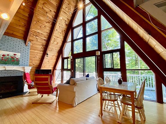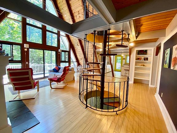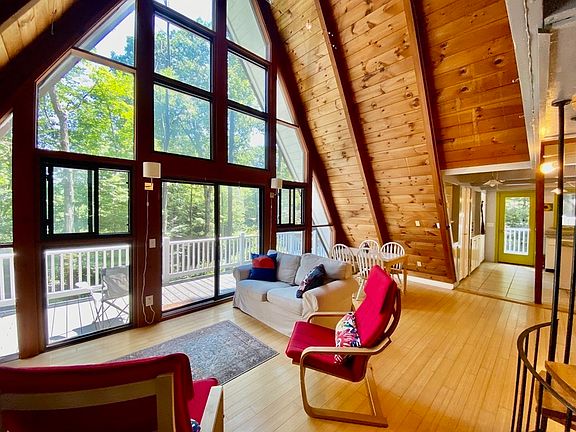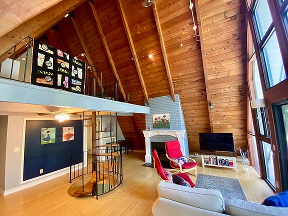 Prepare to fall in love! With cathedral ceilings, open spaces, natural materials, loads of windows, loft, and wrap around decks, this A-frame has charm galore! The first floor easily separates from the rest of the home with its own entrance, 2 bedrooms, full bath, kitchenette, patio, and 2nd living room. This would be a fantastic AirBnb or in-law apartment, or include with the rest of the living area as a 4 bedroom home plus family room. The main level sits on the 2nd floor with a living/dining room that opens to the kitchen & balcony, as well as the main bedroom & bathroom. Upstairs you will find a fantastic loft that has been used as an artists studio, as well as a cozy 4th bedroom. All in a quiet Amherst neighborhood around the corner from a bus stop and Cushman Market! Showings begin at the open house Saturday 7/23 11-1.