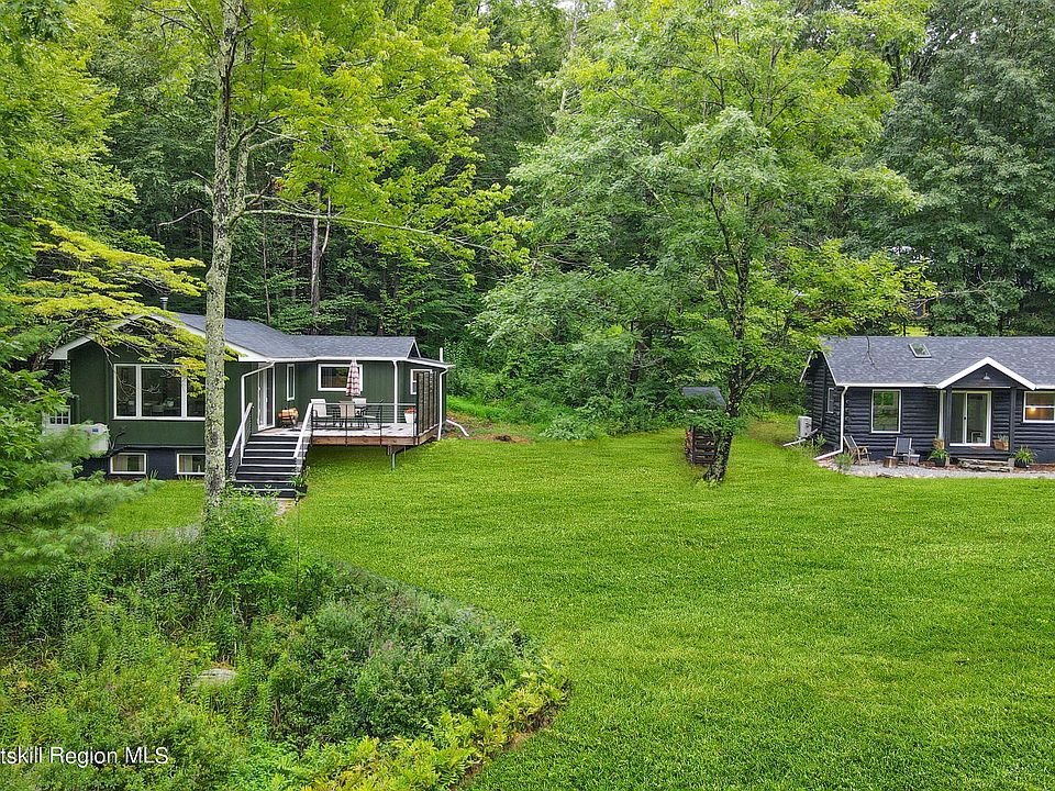 The first dwelling is a charming cottage perfect for those seeking a simpler way of life or looking for the perfect weekend escape from the hustle and bustle of the city. With a total of 1,070 sq., the main level provides a ton of natural light with its large, picturesque windows. Also, on the main level you will find the first bedroom, a bathroom with heated flooring, a newly renovated eat-in kitchen w/ heated flooring and washer & dryer. You can enjoy the cozy woodstove on those cold winter nights or relax on the new deck staring out at the wonderous mountain views in the summertime. The basement of this cottage has been completely finished into a very large bedroom with its own private sitting room space and an emergency exit. All furnishings are also available for separate purchase.