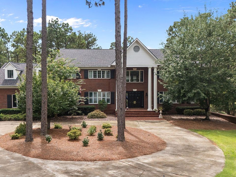 This stately all-brick residence is nestled on a private cut-de-sac within the presitgious Gated Community of Pinewild CC. The classical architectural details are astounding! From the grand staircase, bull-nosed corners, and stunning crown molding the list goes on & on. There are FOUR generous sized en-suite bedrooms.The primary suite is complete with a spa-like bathroom. Off the primary suite is an office with built-in bookshelves. The gourmet kitchen delights with a sub-zero refrigerator, 6-burner gas cooktop, vented cooktop hood, beverage refrigerator, along with a large pantry. The bonus room upstairs offers a wide range of accommodation, from a game room to your own private space. Note the additional storage area with access from the bonus room with newly installed insulated doors. Manage your temperature through Google Nest for optimal savings. The home offers (2) staircases to access the second floor, one accesses the bonus room directly. Outside, the resort-style backyard is a private oasis.Pool, spa, pergola, and patio. This home overlooks the tee box on #7 of the Holly course. Pinewild CC includes two 18-hole Championship Courses, a Gary Player designed par 3 nine-hole course, a 3-hole Challenge course and a magnificent driving range.