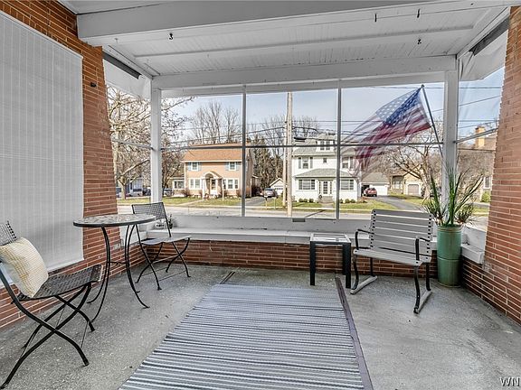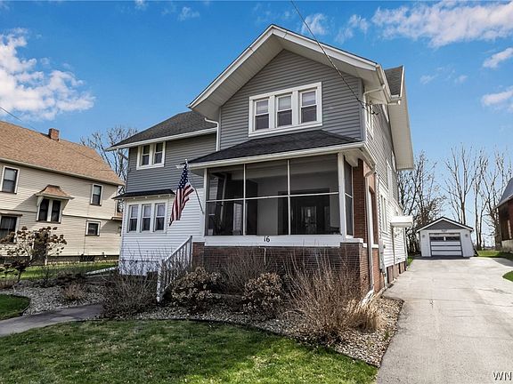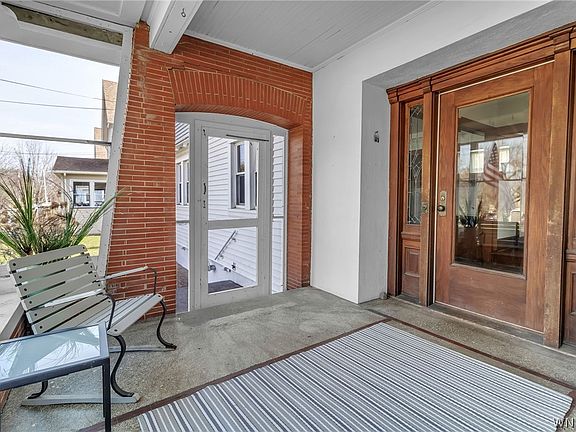 Rare opportunity in the Village of Bergen. Professional landscaping and a large screened front patio welcome you to this charming village home. A large foyer leads you into this well maintained, 4 bdrm. 1.5 bath beauty, featuring natural wood and hardwood floors throughout. Custom built-in bench seating in FR and adjacent to gas fireplace. Kitchen features original glass front cabinets with plenty of storage. Large upstairs landing has a beautiful nook, perfect for reading area or home office. The area is flooded with natural light through the beautiful stained glass windows at top of staircase. From the landing are 4 bedrooms and a fully updated bath with tiled tub/shower. Full walk-up attic where the possibilities are endless! Full basement offers plenty of storage as well as laundry area. Deck off back of house leads to huge backyard, 1.5 car garage with electric and extra storage. Low cost Village electric and “Gray Water” sewage. OPEN HOUSE SATURDAY MARCH 23, 12-3