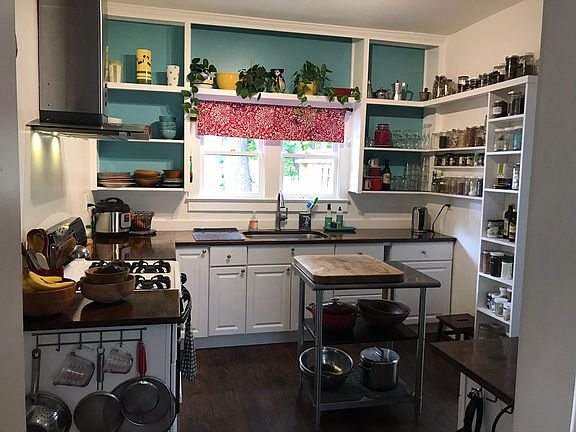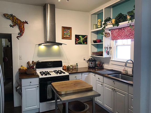 Refinished hardwood floorsBamboo groveOff-street parkingStainless refrigeratorBathroom with marble vanityWood stove fireplaceRenovated kitchen