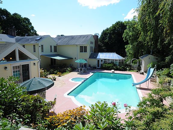 The perfect sanctuary and a unique opportunity unlike others! Magnificent 7,000 SF main house is complemented with a 2,500 SF carriage house with spacious artist studio or reception/office suite with deck, new full bath, and laundry room. Additional four room work office/filming/recording studio with separate full bath and kitchenette area. The main house is a chef's delight! Dream kitchen features brand new custom cabinets and top of the line appliances: Subzero, Wolf 6-burner range with griddle, wine bar refrigerator, double sink, and an expansive honed black granite island. Exuding luxury and discerning choices, a place where lifestyle transcends splendor, this beautifully maintained and updated colonial welcomes you with an open floor plan beckoning your entry into generously-sized rooms and abundant natural sunlight. A grand room perfect for hosting gatherings, family reunions, and school events. A formal dining room with fireplace and built-in cabinets. All rooms with hw floors; this special residence with countless French doors opens to an expansive veranda and gardens. Professionally designed and manicured gardens surround a heated pool and patio. Attached interior glass sunroom with water source and half bathroom allow the perfect opportunity to create your year-round garden. A cherry paneled office/study is ideal for working remotely. Gracious foyer, billiards room, and inviting first floor guest bedroom with en-suite bath accentuate this welcoming home.