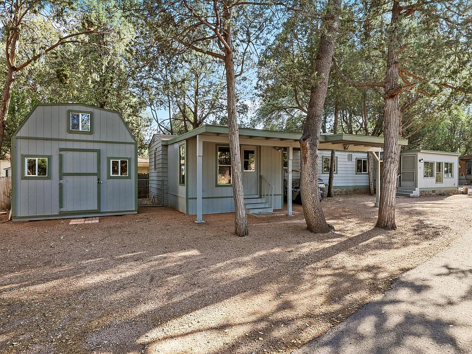 Welcome to this inviting Newly Remodeled 2-bedroom, 2-full bath manufactured home nestled in the serene surroundings of a desirable 55+ community. This charming residence offers a blend of comfort and functionality, complete with thoughtful amenities and a tranquil setting among the tall Ponderosa Pine Trees. Step inside to discover a spacious layout featuring an Arizona room at the front entrance, perfect for enjoying the morning sun or quiet evenings. The interior showcases a well-designed split floor plan, enhancing privacy between the bedrooms. Off the master bedroom, an additional space serves ideally as an office, craft room, or cozy retreat, complemented by convenient access to a washer and dryer. The heart of the home boasts a welcoming living area that flows seamlessly into a functional kitchen with ample cabinet space and a dining area. A screened-in patio at the rear overlooks the fenced backyard adorned with tall trees, offering a peaceful outdoor sanctuary. It comes complete with a hot tub for added relaxation. Additional highlights include a shed for storage and a covered carport, ensuring ample space for belongings and vehicles. Residents of this community enjoy a vibrant lifestyle with amenities such as a dog park, pickleball court, gym, clubhouse, and a community garden. The monthly rent space of $595 covers water, sewer, and trash services, providing exceptional value and convenience. Perfectly situated in a tranquil environment yet close to local conveniences, this home presents an ideal opportunity for comfortable living in a welcoming community. Embrace a relaxed lifestyle today. Please note that the additions to the home are not reflected in the square footage of 980.