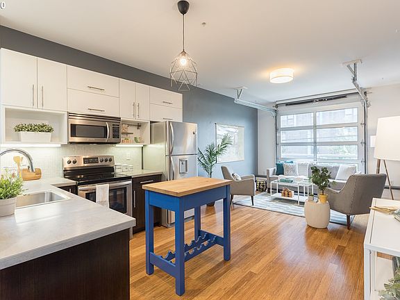 This location truly can't be beat! 1 block from restaurants, cafes, New Seasons, stores. Take out around here is a breeze! But who needs to go out when you can stay at home in this spacious unit with a glass roll up door that opens to a Juliet balcony to flood the unit with an abundance of light. Updated finishes throughout. Bedrooms upstairs anchored by a lofted skylight.Convenient laundry upstairs. The master has a private balcony, perfect to sit outside, have a beer, & watch the world go by.
