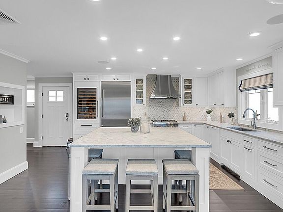 Welcome to Falmouth Heights! This 7-year young Stunning home features ocean views, custom shaker inset cabinetry, high-end appliances with 36-inch range, beautiful new hood direct venting, built-in refrigerator, wine refrigerator and drawers. The sitting island with marble counters is the perfect place to gather after a day at the beach! The dark hardwood flooring throughout the home accented by the light and bright paint, cabinetry, high-end decor gives this home the perfect beach chic vibe. The open plan is great space for entertaining with a well-appointed chandelier gracing the dining space and gas fireplace centering the living area. The primary suite has plenty of closet space, king size bed, and on suite marble bath. There are 2 more rooms on the second level along with full bath. The dramatic cabled staircase leads to the 3rd floor with office, 1/2 bath, custom ''hinkley' style wet bar and 3rd floor deck for sunset ocean views! Outdoor patio/gas firepit/shower/shed a must see! Turn Key with high-end furnishings included! Art and decor excluded