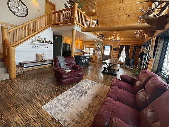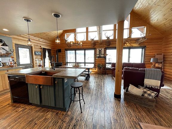 Exquisite views of the Beartooth Front and a small flowing waterway boarders the back of this spectacular 2,700 square foot remodeled furnished log home. The mature landscaped yard with underground sprinkling system, gives the property a lot of privacy and welcomes the wildlife in. This 4 BR/3 1/2 baths home with double attached garage with an 1 bedroom 1 bath apartment that has a 3 month rental history this past summer of bringing in $3,300 a month is a one of a kind. You will enjoy the open deluxe kitchen with concrete counter tops/dining and living room with large vaulted cathedral ceilings. Private master suite. Minutes from Red Lodge.