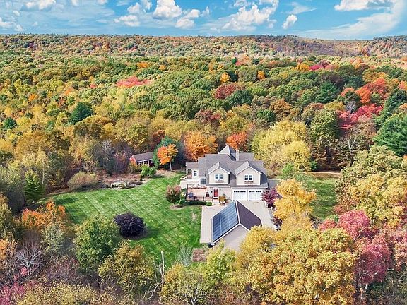 SENSATIONAL solar savings... A little slice of heaven awaits you in this CUSTOM Blt home on 4 + acres featuring a TWO car attached heated garage & TWO-car detached HEATED/AC garage w/ stairs to a 2nd flr storage area. The main home offers an open flr plan, custom millwork, coffered ceilings, crown moulding & hdwd flrs throughout. The spacious kitchen boasts a 5-burner gas c-top, pantry, cabinetry galore, oversized island & dining area leading to a deck w/ seasonal scenic/sunrise views. The grand living rm is flanked by windows, opens to a private office, sunroom to covered deck dining, cozy den w/ French drs, grand foyer, formal dining rm & half bth. The 2nd flr highlights a lux main en suite w/ a massive custom walk-in closet, full bth w/ double vanity, qtz c-tops, steam shower w/ 3 heads, & soaking tub. Double door to the main bdrm/sitting area, while 2 add'l bdrms & a guest bth occupy the opposite wing. HIGHEST & BEST by Sunday 2/2 at 5pm. NO escalations