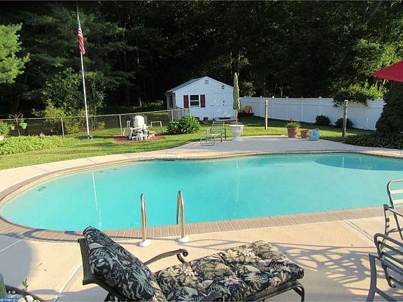 Approaching this expanded ranch you will be delighted with the concrete driveway, the stamped concrete front walk bringing you up to the front porch. This home offers a great room with a cathedral ceiling, eat in kitchen, formal dining room, living room, 3 spacious bedrooms and 2 1/2 baths. The walk-out basement is partially finished (needing floor covering) and features a dry bar in a rec room, laundry with sink and laundry chute, work and storage space and a full bathroom, a great convenience. The back yard is fenced and has an in ground swimming pool, which has been recently refinished. The pool is professionally opened, cleaned and closed each season. Hardwood flooring is found in the living room, dining room, foyer and bedrooms. The extended great room features a slate floor. The garage was converted into a hobby room and storage/pantry closet. This home is located in East Windsor Township, and can also have a Cranbury, NJ 08512 mailing address.